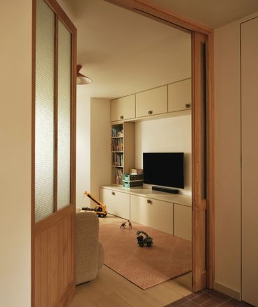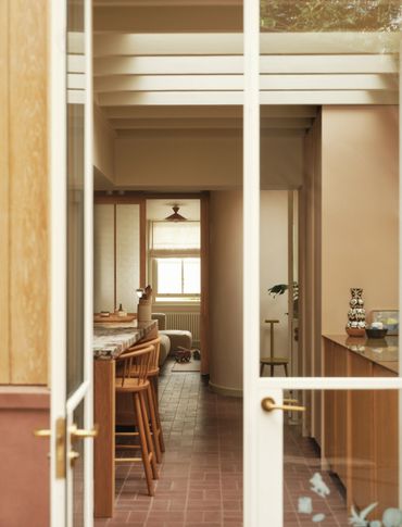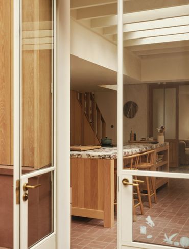 Beyond the kitchen, the work extends through the house in the form of a built-in dining bench, a floating desk with integrated seating, and made-to-measure wardrobe joinery. Each element was designed with the same logic: minimal visual noise, clear lines, and a focus on how the pieces are used day to day.