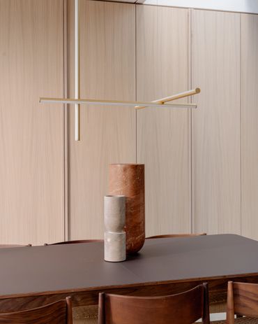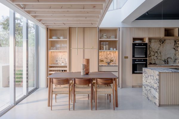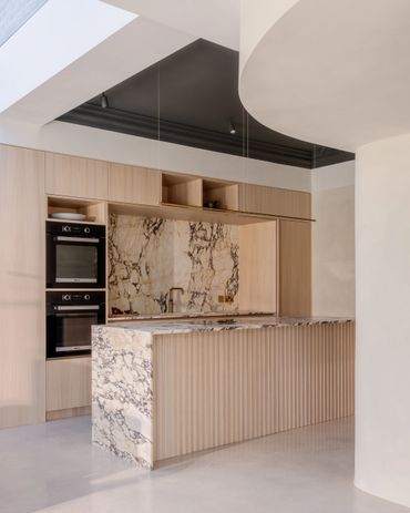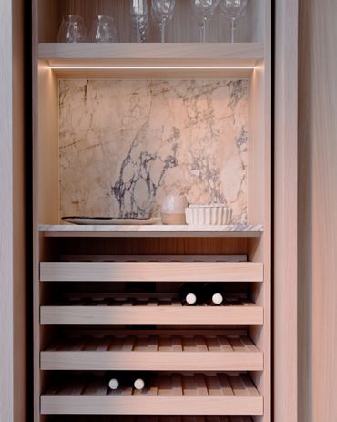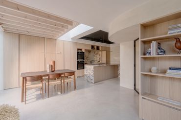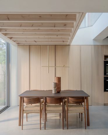 The kitchen is composed with a calm, material-focused language: pale oak cabinetry with fine reveals and uninterrupted surfaces provides generous storage, while integrated worktops and a waterfall island unify the room. Precision in proportion and detail allows the cabinetry to support the day-to-day life of a growing family while maintaining an ordered, uncluttered presence.