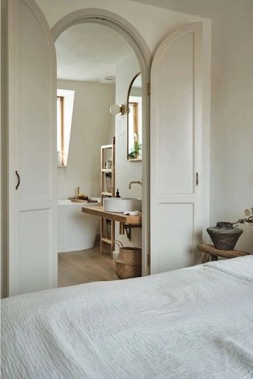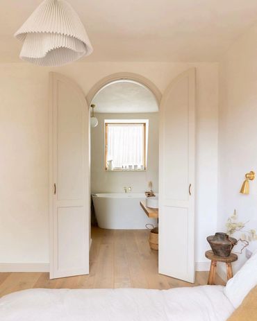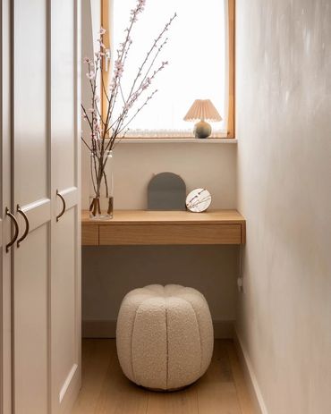 At the centre of the house sits a fully bespoke kitchen and island, paired with a custom pantry defined by fluted glass doors. The joinery was designed to feel integrated and balanced, supporting everyday use while maintaining a calm, understated presence. Beyond the kitchen, our work extends through the home in the form of floating desks, bespoke wardrobe fronts, an arched bathroom door, and a floating bathroom vanity. Each element was developed as part of a wider joinery language, allowing different rooms to feel connected without repetition. The result is a series of pieces that feel considered, purposeful, and quietly confident within their setting.